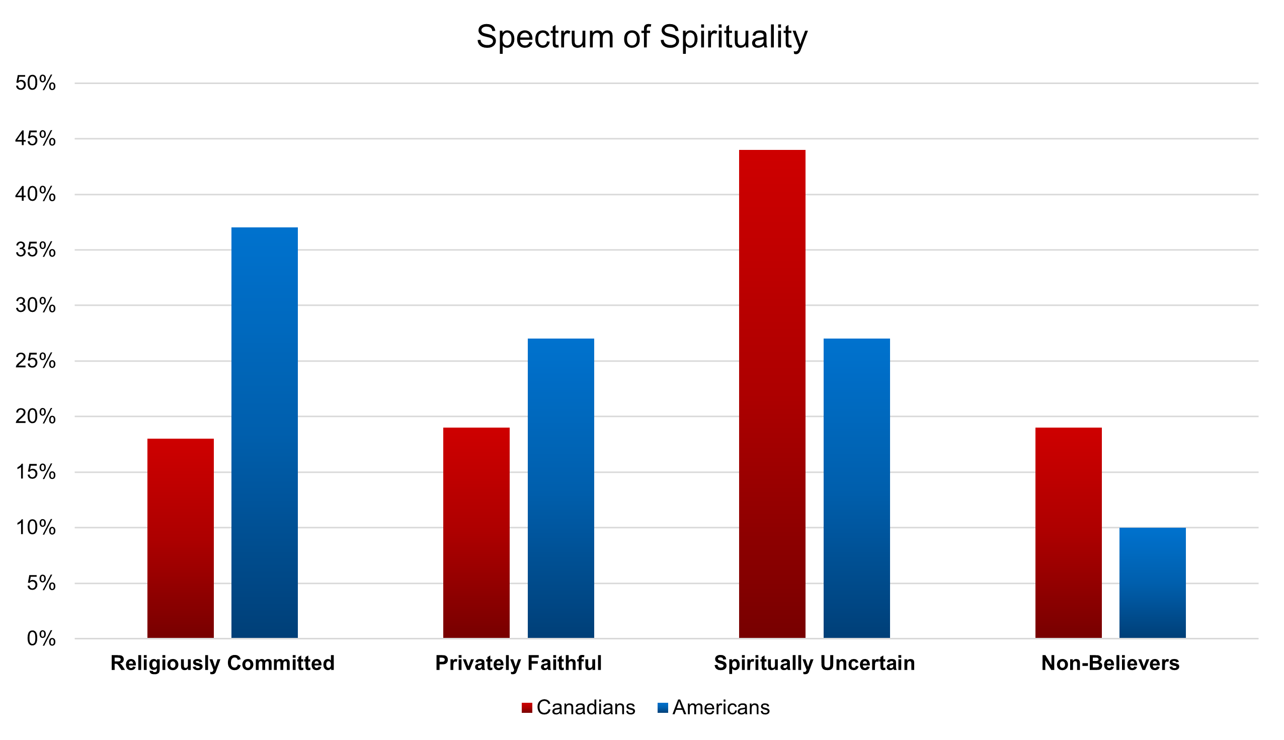 The privately faithful engage in some religious behaviours but are often skeptical of organized religion. The spiritually uncertain believe in a higher power and may sometimes think about a reality beyond the physical world. Non-believers completely reject religion.