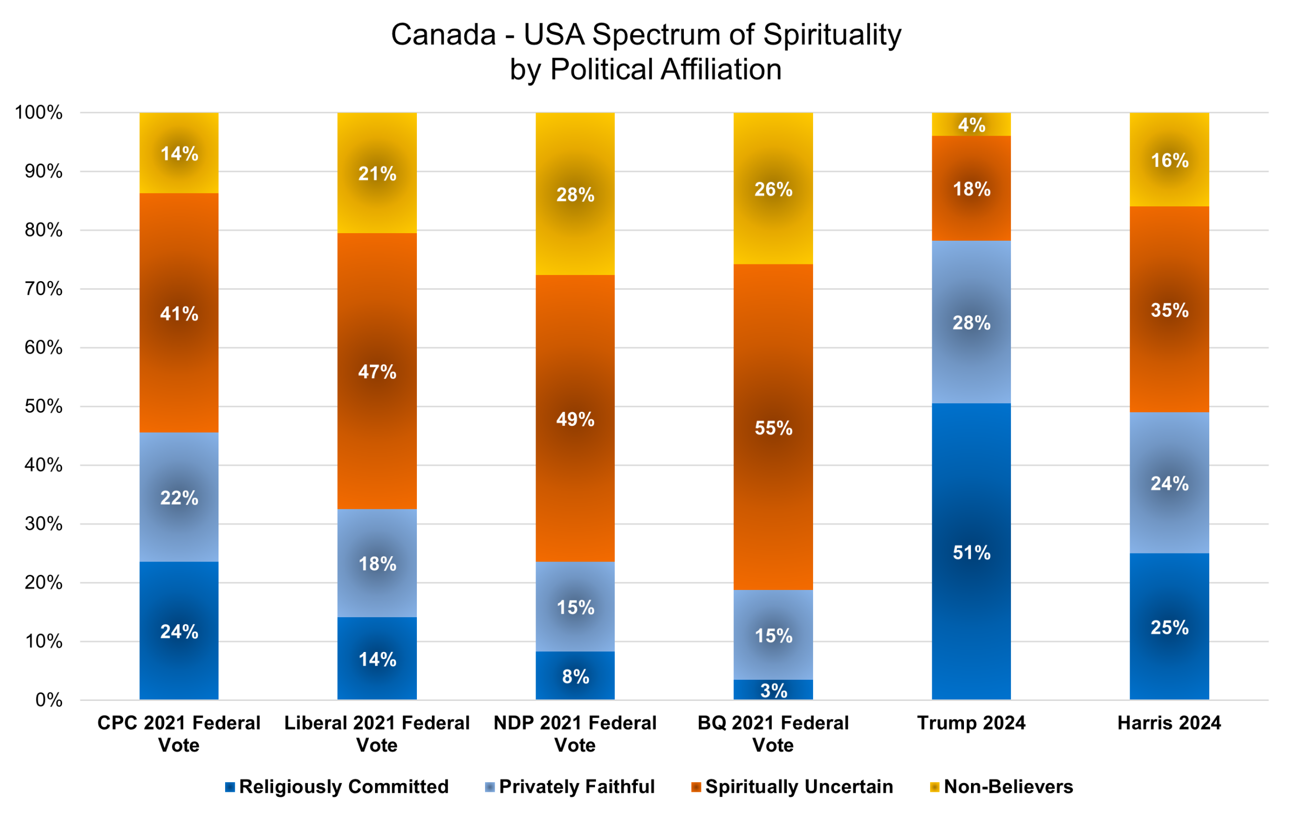 “Despite their policy differences, Canada’s federal Conservative voters most closely match 2024 supporters of Democrat Kamala Harris in terms of religious intensity,” says Pennings. “This suggests that religious Canadians aren’t easily packed into tidy ideological boxes.”