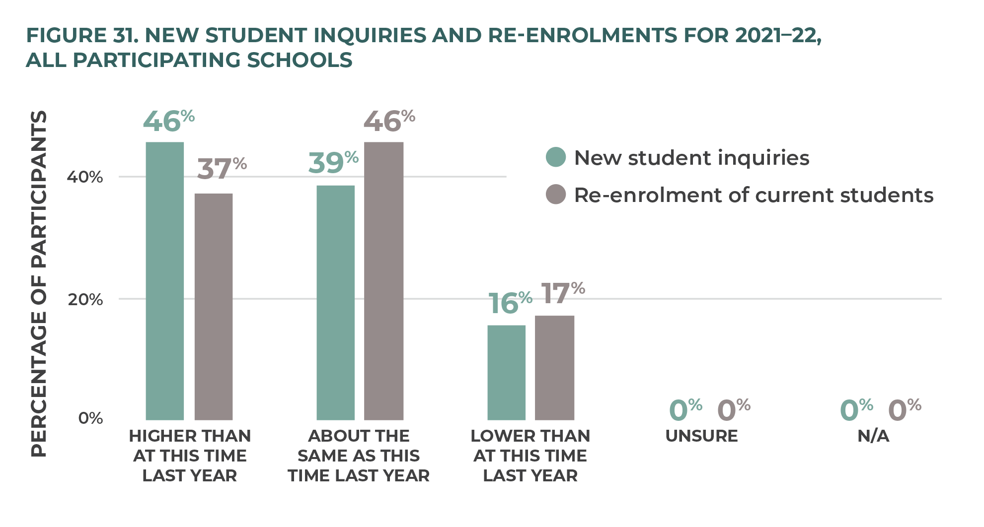Respondents were asked to consider their present enrolment interest and projections compared to previous years. About one-sixth of schools (16 percent) indicated that their new student inquiries were lower than at the same time last year, and a near-identical 17 percent indicated that re-enrolment of current students is anticipated to be lower than at the same time in the previous year (figure 31).