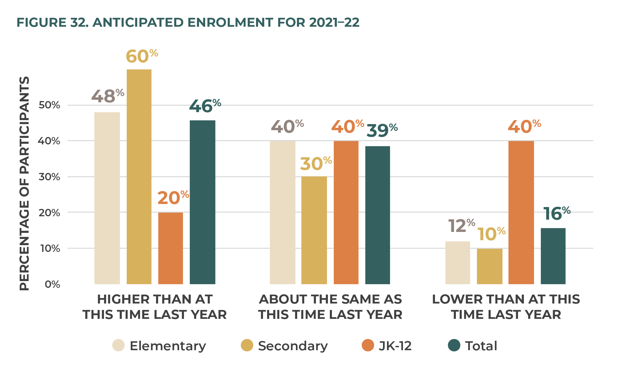 Only 10 percent of secondary schools and 12 percent of elementary schools anticipated lower enrolment in September 2021, whereas 40 percent of JK–12 schools anticipated lower enrolment in the coming school year (figure 32).