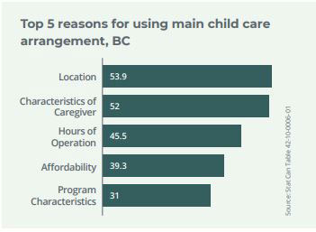 Affordability is a much-discussed issue, but parents choose care based on their needs and desires. According to the survey, the top reasons parents who use non-parental care select the type of care they do are location (53.9%), the characteristics of the individual providing care (52%), and hours of operation (45.5%). Furthermore, many parents depend on in-home care or relatives, while about 42 percent of parents with children under six in BC do not currently use non-parental care.