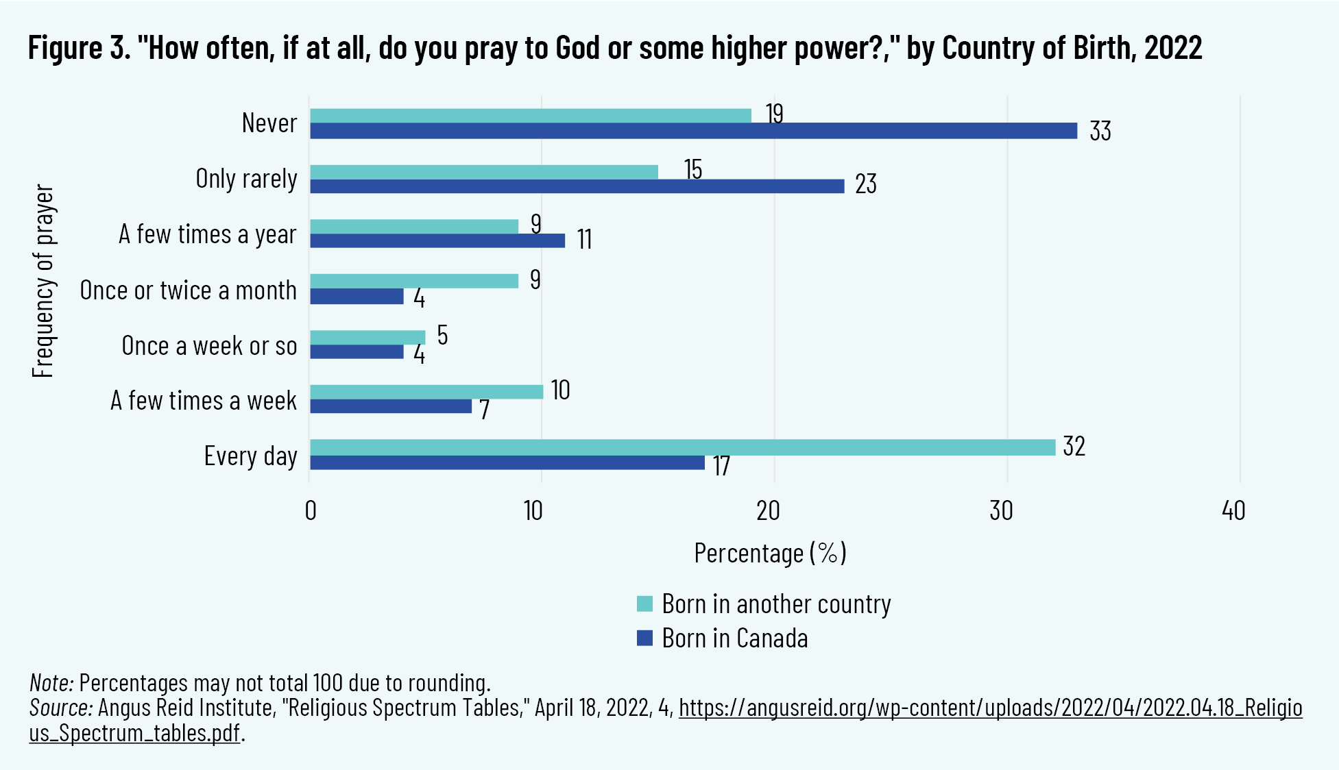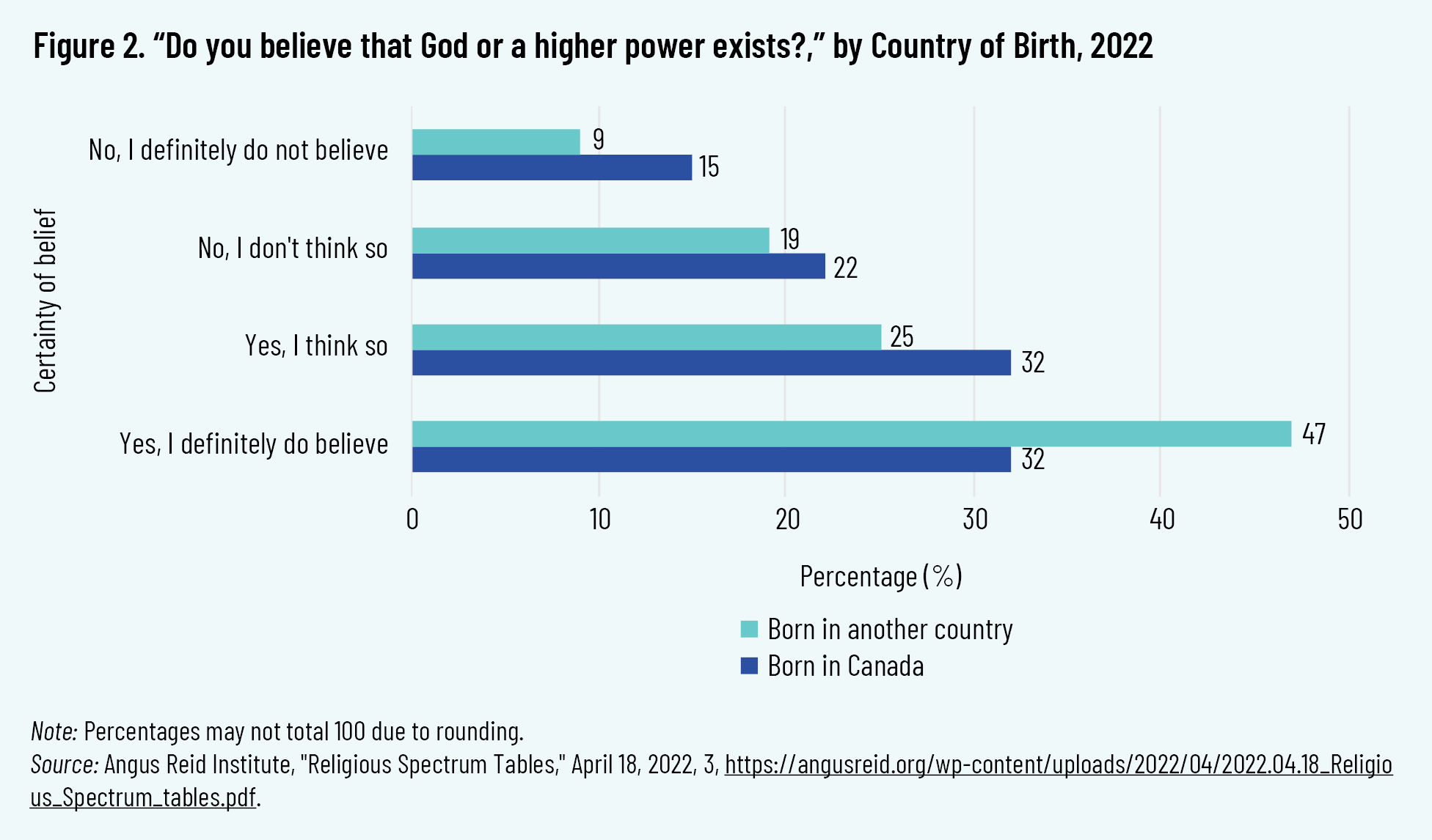 When asked whether they believe that God or a higher power exists, 47 percent of respondents born in another country say they definitely believe this, compared to 32 percent of respondents born in Canada. 5 5 J. Lewis, “Religion and Belief Among Immigrants to Canada,” July 2023, 4, https://cardus.ca/research/faith-communities/research-brief/religion-and-belief-among-immigrants-to-canada/.