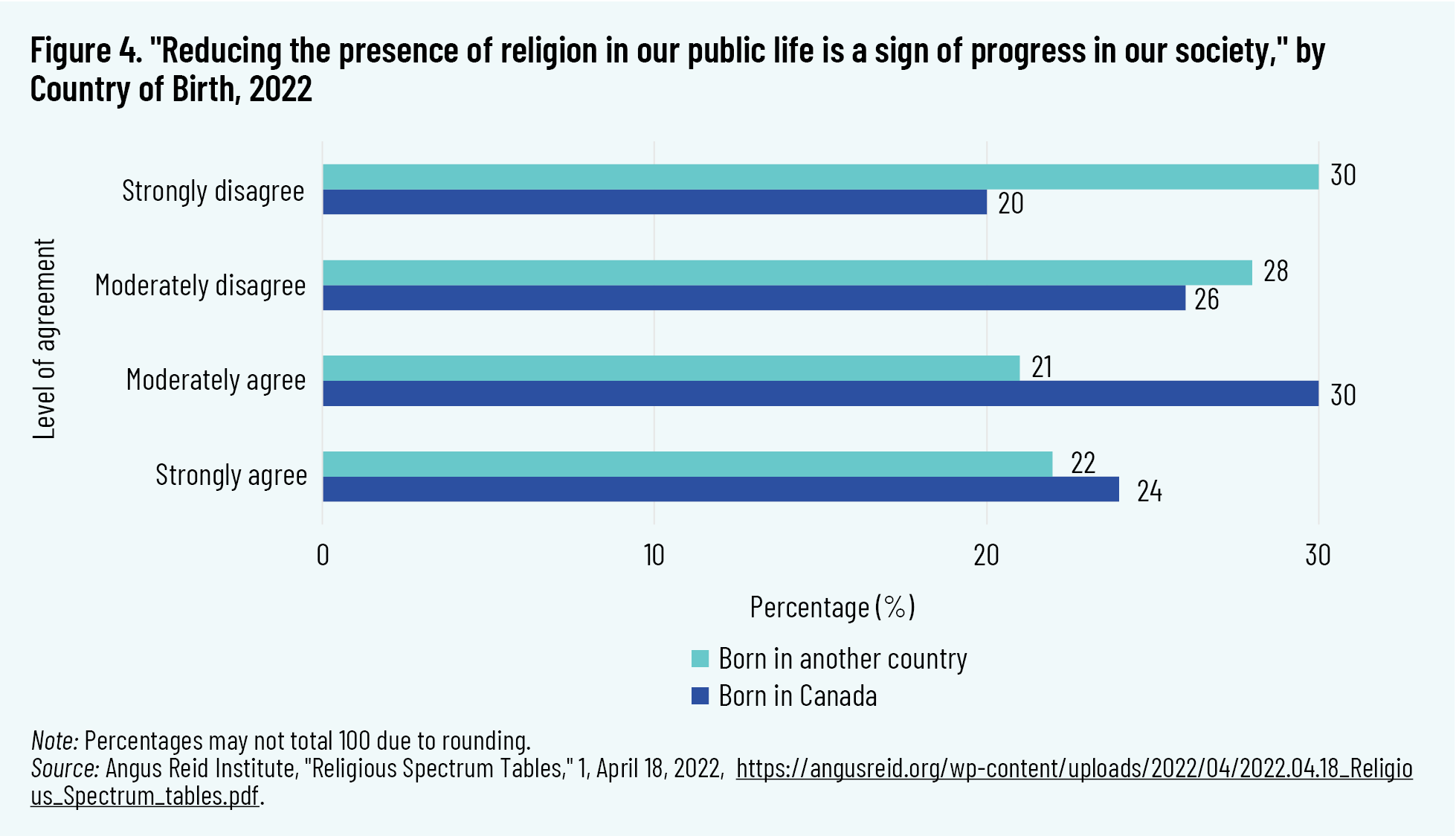 When asked to agree or disagree with the statement, “Reducing the presence of religion in our public life is a sign of progress in our society,” 58 percent of those born outside Canada disagree either strongly or somewhat, compared to 46 percent of Canadian-born respondents. 10 10 Lewis, “Religion and Belief,” 9.